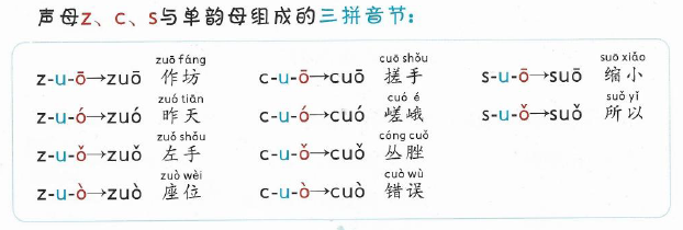 z c s与单韵母组成的三拼音节